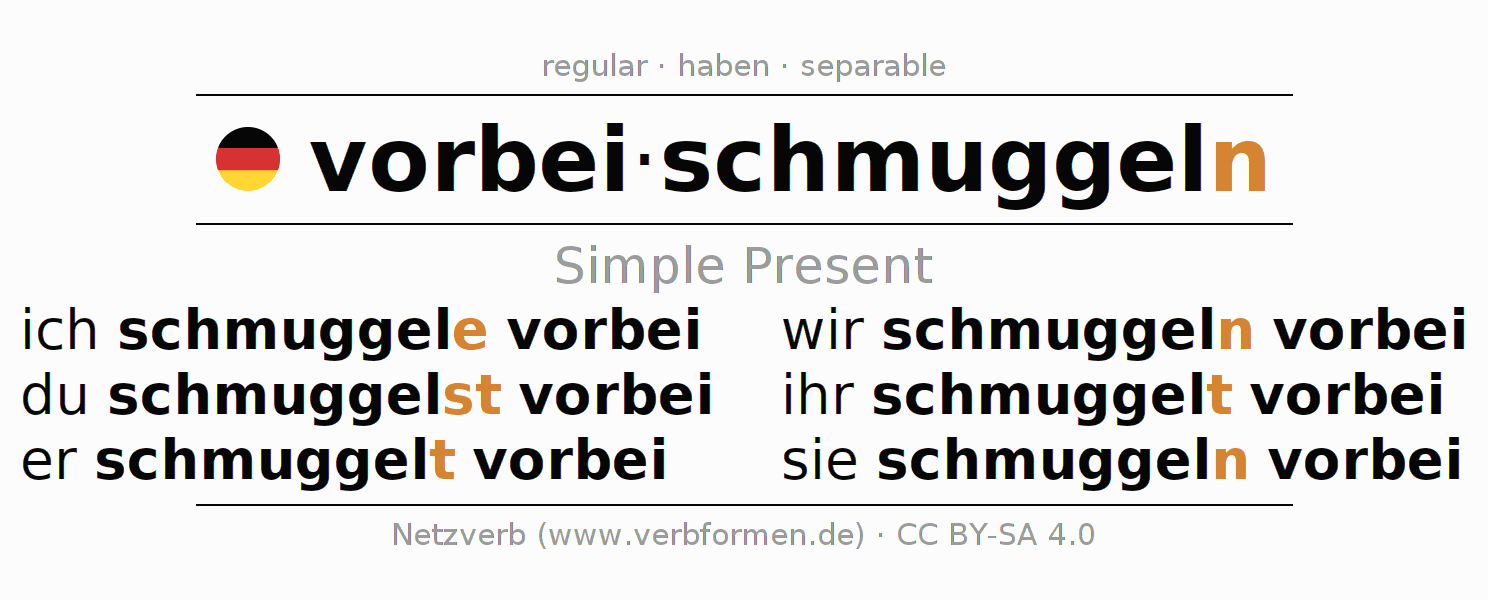 The conjugation of vorbeischmuggeln (smuggle past, sneak by) in the present tense is: ich schmugg(e)le vorbei, du schmuggelst vorbei, er schmuggelt vorbei, wir schmuggeln vorbei, ihr schmuggelt vorbei, sie schmuggeln vorbei. For this purpose, the endings -e, -st, -t, -n, -t, -n are appended to the stem schmuggel. The endings in the 1st and 3rd person plural are shortened by "e", since the verb ends with -eln.In addition, the "e" in the stem can be omitted in the 1st person singular. The prefix vorbei- of vorbeischmuggeln is separated.The formation of the forms corresponds to the grammatical rules for the conjugation of the verbs in the present tense. Comments ☆