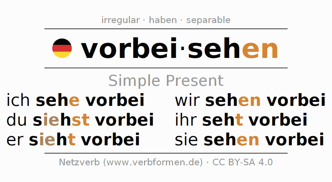 The conjugation of vorbeisehen (look past, overlook) in the present tense is: ich sehe vorbei, du siehst vorbei, er sieht vorbei, wir sehen vorbei, ihr seht vorbei, sie sehen vorbei. For this purpose, the endings -e, -st, -t, -en, -t, -en are appended to the stem seh.As an irregular verb in the 2nd and 3rd person singular the changed present stem sieh- is used. The prefix vorbei- of vorbeisehen is separated.The formation of the forms corresponds to the grammatical rules for the conjugation of the verbs in the present tense. Comments ☆