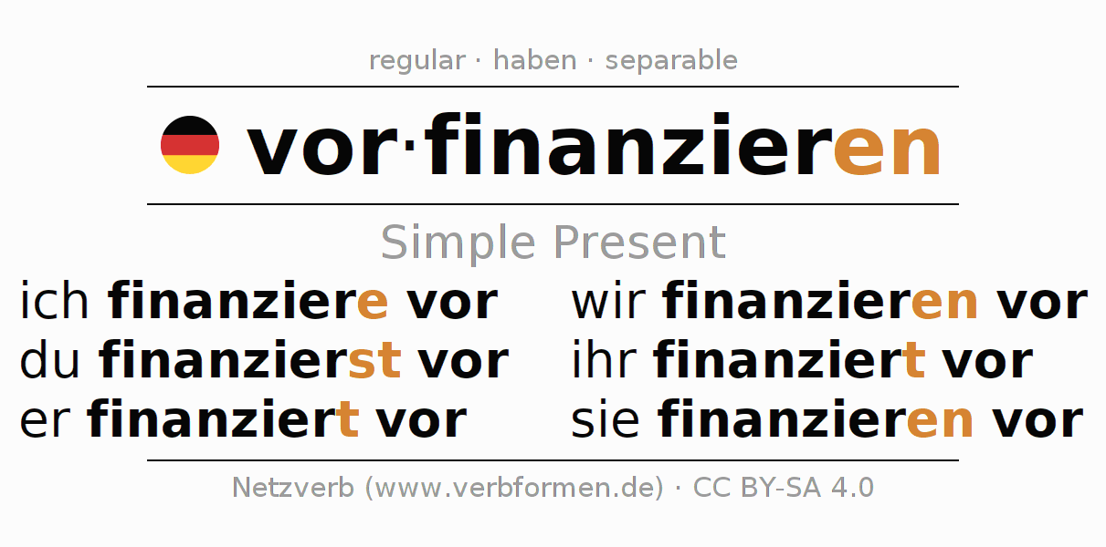 The conjugation of vorfinanzieren (pre-finance, advance financing) in the present tense is: ich finanziere vor, du finanzierst vor, er finanziert vor, wir finanzieren vor, ihr finanziert vor, sie finanzieren vor. For this purpose, the endings -e, -st, -t, -en, -t, -en are appended to the stem finanzier. The prefix vor- of vorfinanzieren is separated.The formation of the forms corresponds to the grammatical rules for the conjugation of the verbs in the present tense. Comments ☆