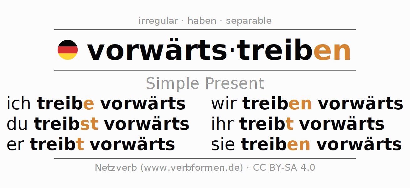 The verb vorwärtstreiben fully conjugated in all persons and numbers in the Present Indicative