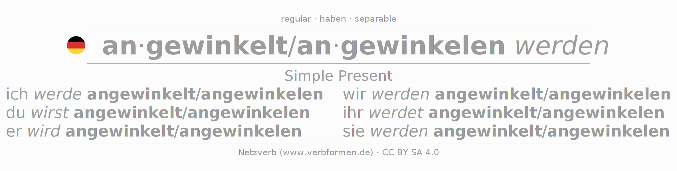 The verb anwinkeln fully conjugated in all persons and numbers in the Present Indicative