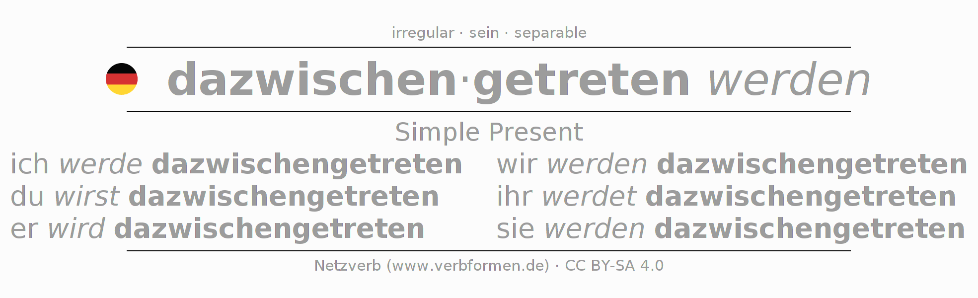 The verb dazwischentreten fully conjugated in all persons and numbers in the Present Indicative