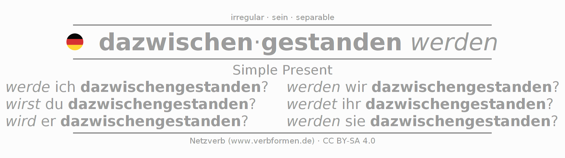 The verb dazwischenstehen (ist) fully conjugated in all persons and numbers in the Present Indicative