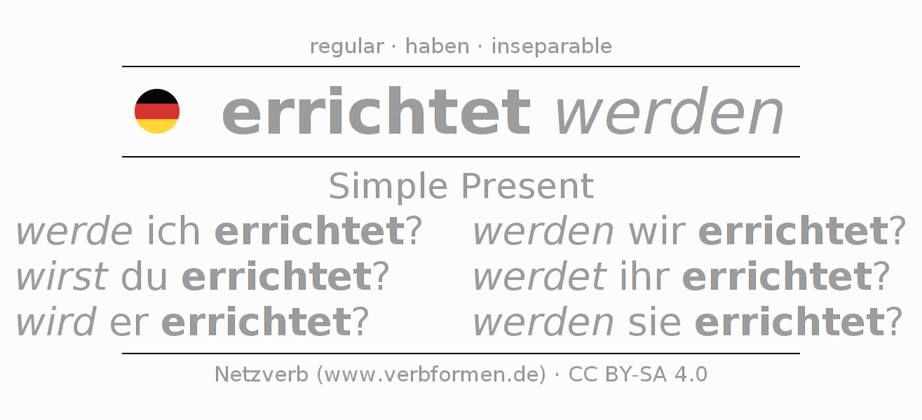 The conjugation of errichten in Present Indicative Presence Passive is werde ich errichtet?, wirst du errichtet?, wird er errichtet?, werden wir errichtet?, werdet ihr errichtet?, werden sie errichtet?.The conjugation corresponds to certain grammatical rules. Likewise the requirements for the conjugation of the simple verb forms of errichten in Present. Comments ☆