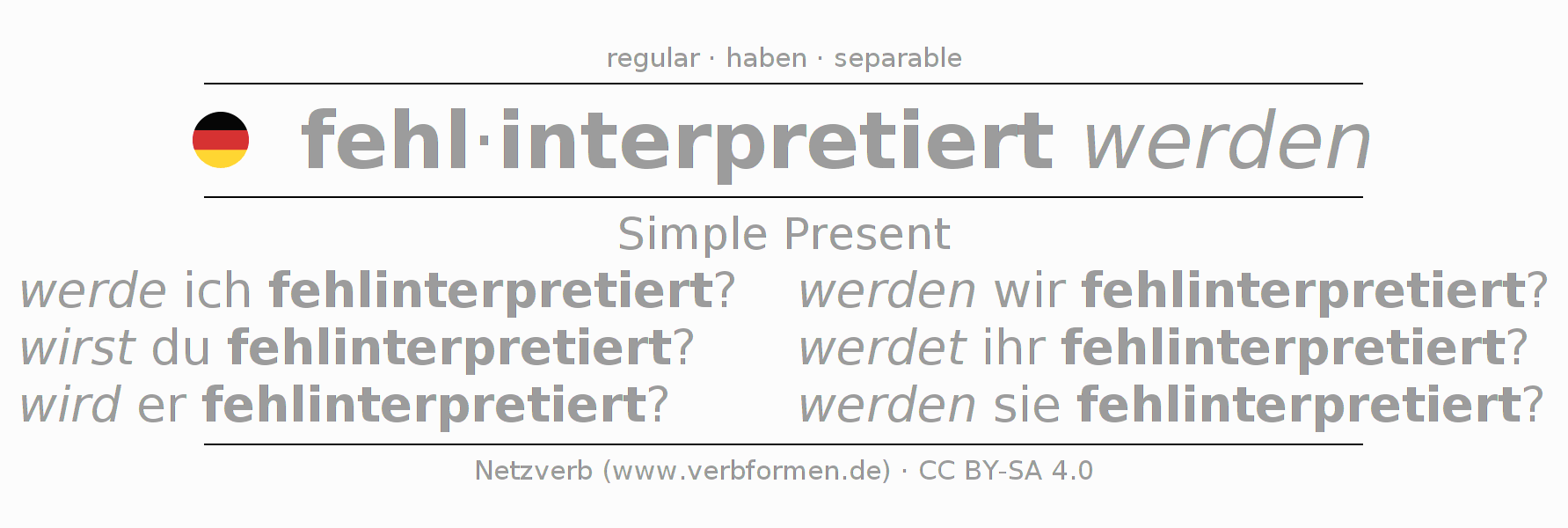 The verb fehlinterpretieren fully conjugated in all persons and numbers in the Present Indicative
