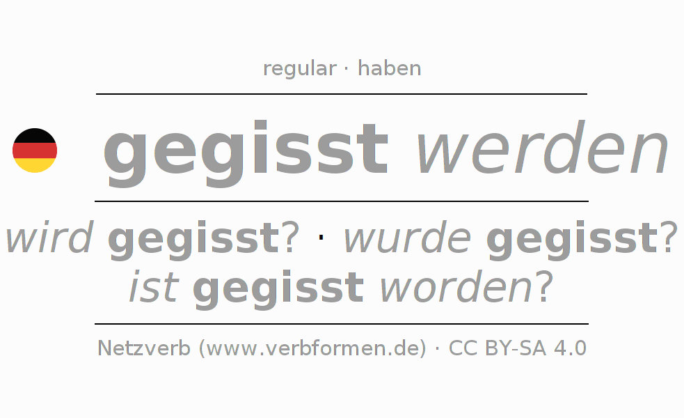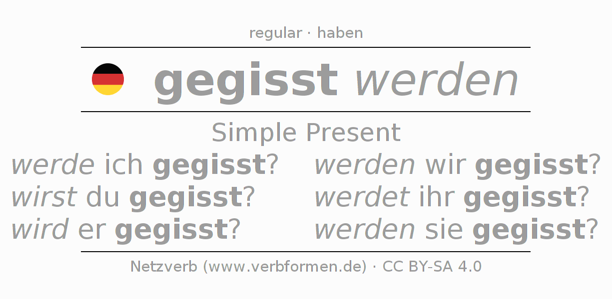 The conjugation of gissen in Present Indicative Presence Passive is werde ich gegisst?, wirst du gegisst?, wird er gegisst?, werden wir gegisst?, werdet ihr gegisst?, werden sie gegisst?.The conjugation corresponds to certain grammatical rules. Likewise the requirements for the conjugation of the simple verb forms of gissen in Present. Comments ☆