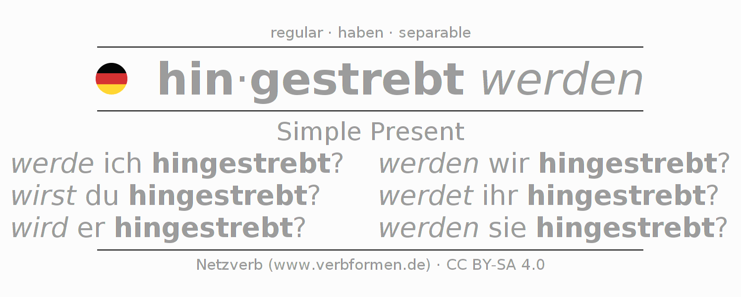 The conjugation of hinstreben in Present Indicative Presence Passive is werde ich hingestrebt?, wirst du hingestrebt?, wird er hingestrebt?, werden wir hingestrebt?, werdet ihr hingestrebt?, werden sie hingestrebt?.The conjugation corresponds to certain grammatical rules. Likewise the requirements for the conjugation of the simple verb forms of hinstreben in Present. Comments ☆