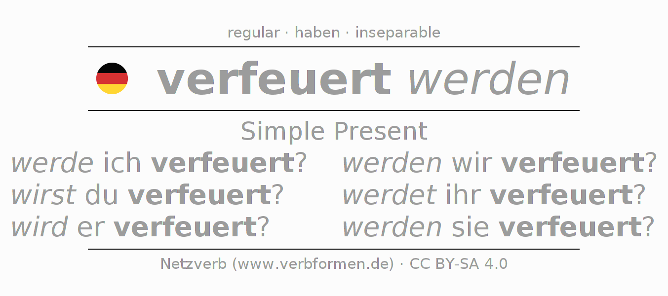 The conjugation of verfeuern in Present Indicative Presence Passive is werde ich verfeuert?, wirst du verfeuert?, wird er verfeuert?, werden wir verfeuert?, werdet ihr verfeuert?, werden sie verfeuert?.The conjugation corresponds to certain grammatical rules. Likewise the requirements for the conjugation of the simple verb forms of verfeuern in Present. Comments ☆