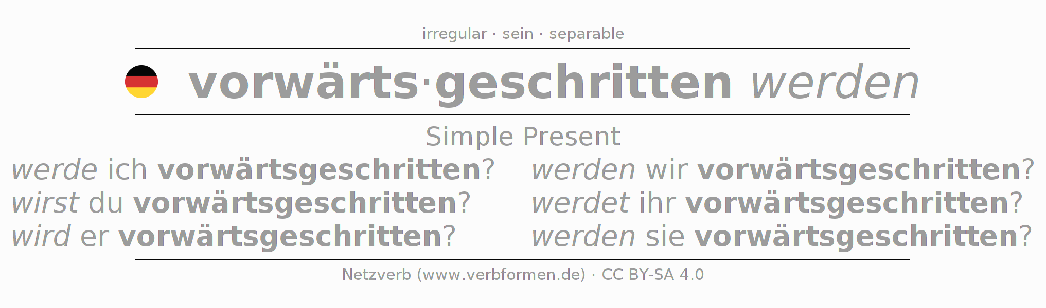 The verb vorwärtsschreiten fully conjugated in all persons and numbers in the Present Indicative