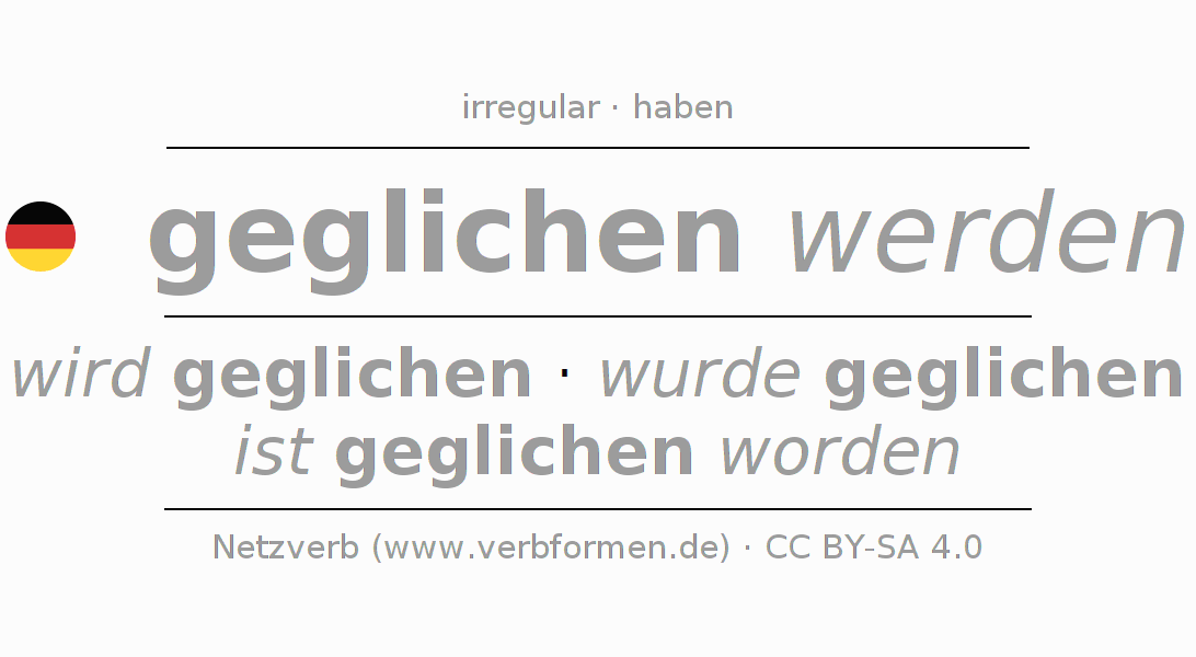 The conjugation of gleichen in Present Indicative Presence Passive is ich werde geglichen, du wirst geglichen, er wird geglichen, wir werden geglichen, ihr werdet geglichen, sie werden geglichen.The conjugation corresponds to certain grammatical rules. Likewise the requirements for the conjugation of the simple verb forms of gleichen in Present. Comments ☆