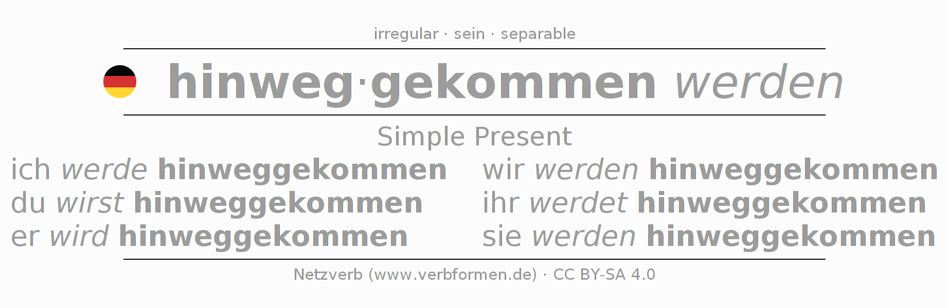 The conjugation of hinwegkommen in Present Indicative Presence Passive is ich werde hinweggekommen, du wirst hinweggekommen, er wird hinweggekommen, wir werden hinweggekommen, ihr werdet hinweggekommen, sie werden hinweggekommen.The conjugation corresponds to certain grammatical rules. Likewise the requirements for the conjugation of the simple verb forms of hinwegkommen in Present. Comments ☆