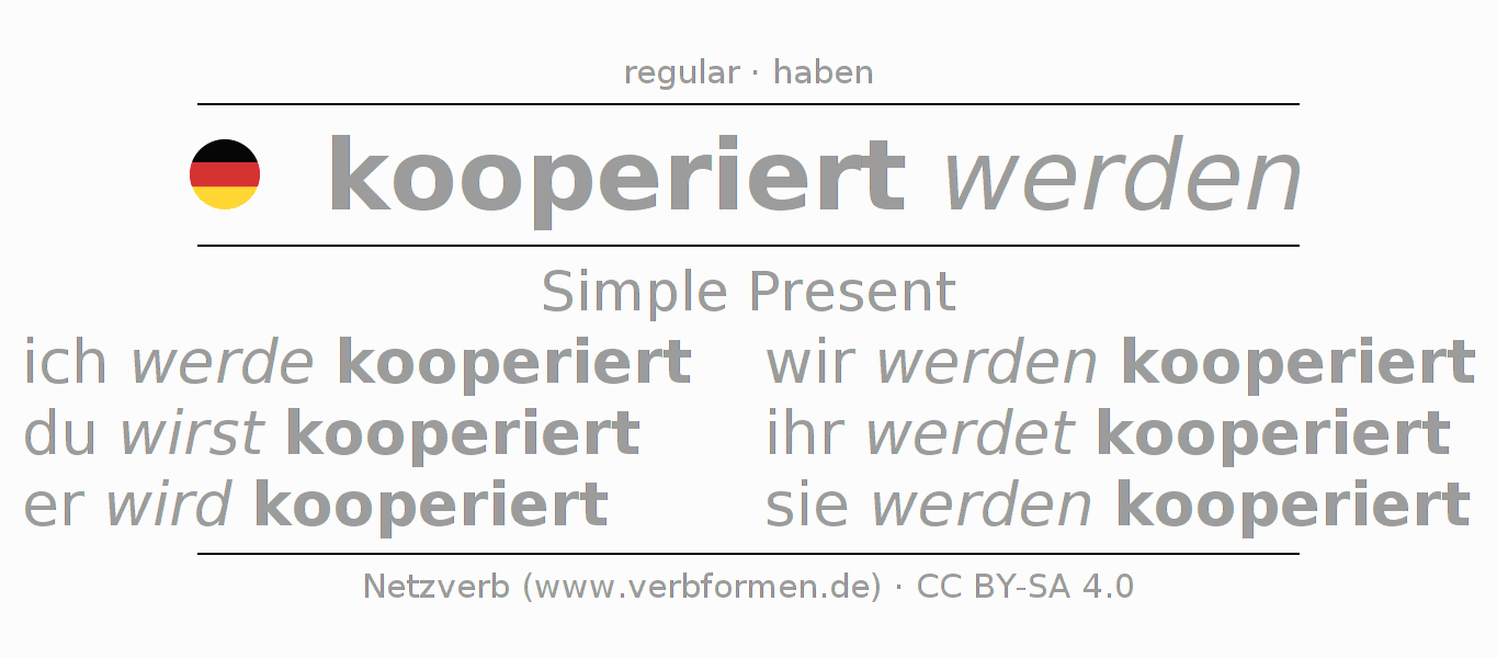 The conjugation of kooperieren in Present Indicative Presence Passive is ich werde kooperiert, du wirst kooperiert, er wird kooperiert, wir werden kooperiert, ihr werdet kooperiert, sie werden kooperiert.The conjugation corresponds to certain grammatical rules. Likewise the requirements for the conjugation of the simple verb forms of kooperieren in Present. Comments ☆