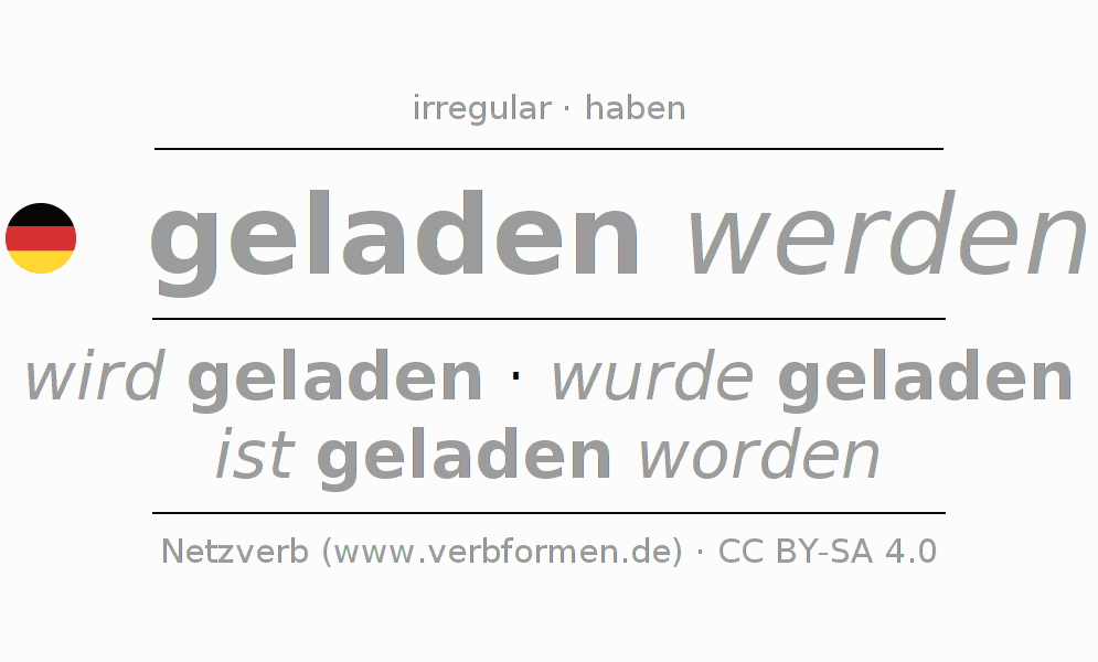 The conjugation of laden in Present Indicative Presence Passive is ich werde geladen, du wirst geladen, er wird geladen, wir werden geladen, ihr werdet geladen, sie werden geladen.The conjugation corresponds to certain grammatical rules. Likewise the requirements for the conjugation of the simple verb forms of laden in Present. Comments ☆