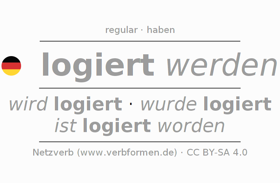 The conjugation of logieren in Present Indicative Presence Passive is ich werde logiert, du wirst logiert, er wird logiert, wir werden logiert, ihr werdet logiert, sie werden logiert.The conjugation corresponds to certain grammatical rules. Likewise the requirements for the conjugation of the simple verb forms of logieren in Present. Comments ☆