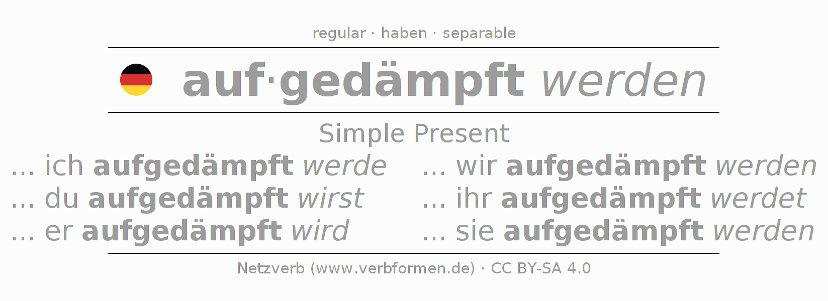 The verb aufdämpfen fully conjugated in all persons and numbers in the Present Indicative
