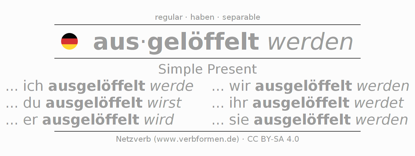 The conjugation of auslöffeln in Present Indicative Presence Passive is ... ich ausgelöffelt werde, ... du ausgelöffelt wirst, ... er ausgelöffelt wird, ... wir ausgelöffelt werden, ... ihr ausgelöffelt werdet, ... sie ausgelöffelt werden.The conjugation corresponds to certain grammatical rules. Likewise the requirements for the conjugation of the simple verb forms of auslöffeln in Present. Comments ☆
