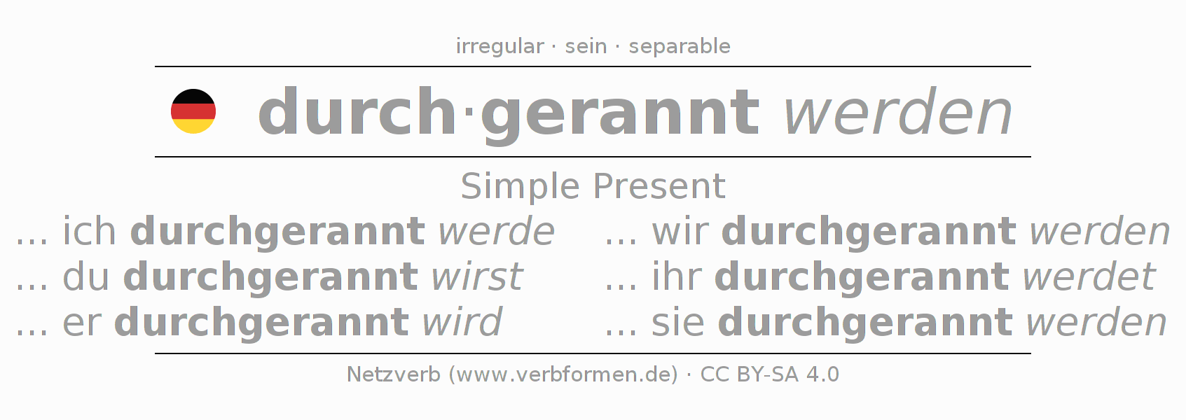 The conjugation of durchrennen in Present Indicative Presence Passive is ... ich durchgerannt werde, ... du durchgerannt wirst, ... er durchgerannt wird, ... wir durchgerannt werden, ... ihr durchgerannt werdet, ... sie durchgerannt werden.The conjugation corresponds to certain grammatical rules. Likewise the requirements for the conjugation of the simple verb forms of durchrennen in Present. Comments ☆