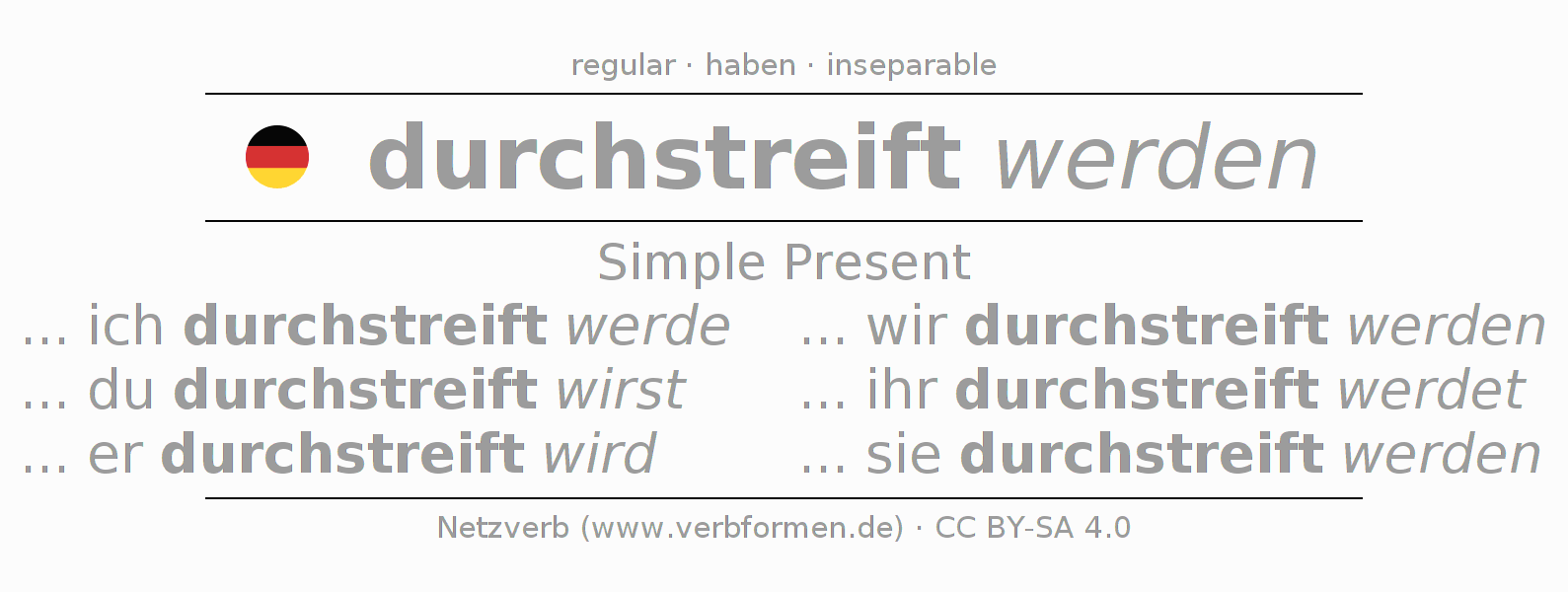 The conjugation of durchstreifen in Present Indicative Presence Passive is ... ich durchstreift werde, ... du durchstreift wirst, ... er durchstreift wird, ... wir durchstreift werden, ... ihr durchstreift werdet, ... sie durchstreift werden.The conjugation corresponds to certain grammatical rules. Likewise the requirements for the conjugation of the simple verb forms of durchstreifen in Present. Comments ☆