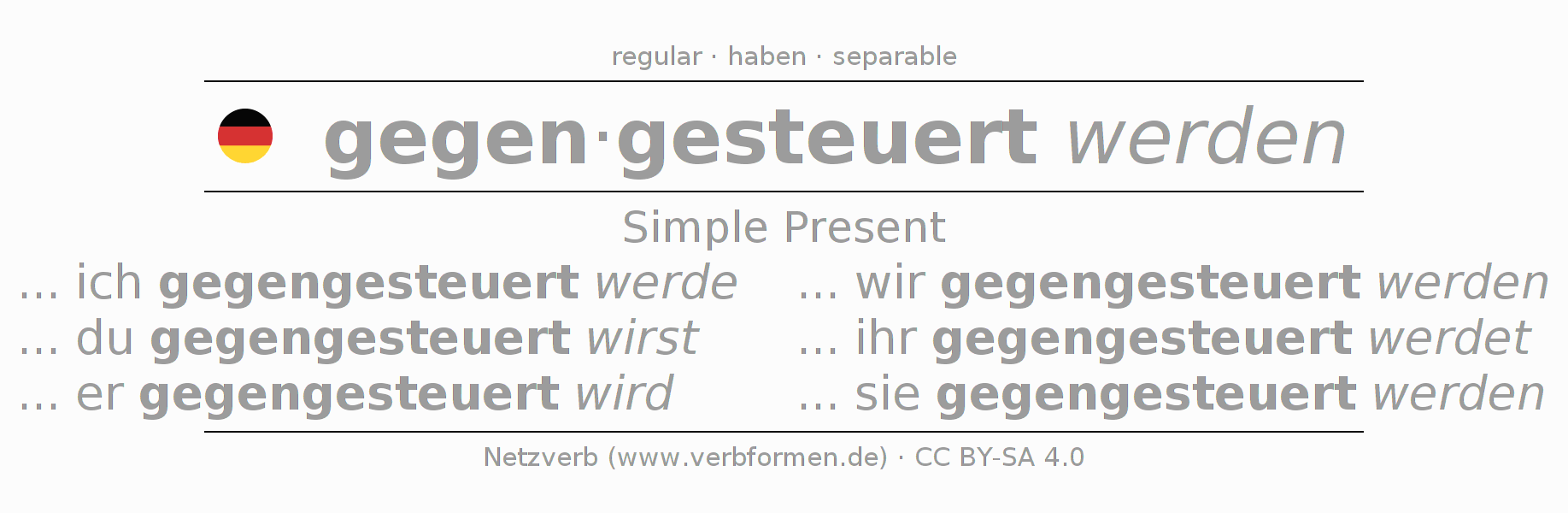 The conjugation of gegensteuern in Present Indicative Presence Passive is ... ich gegengesteuert werde, ... du gegengesteuert wirst, ... er gegengesteuert wird, ... wir gegengesteuert werden, ... ihr gegengesteuert werdet, ... sie gegengesteuert werden.The conjugation corresponds to certain grammatical rules. Likewise the requirements for the conjugation of the simple verb forms of gegensteuern in Present. Comments ☆