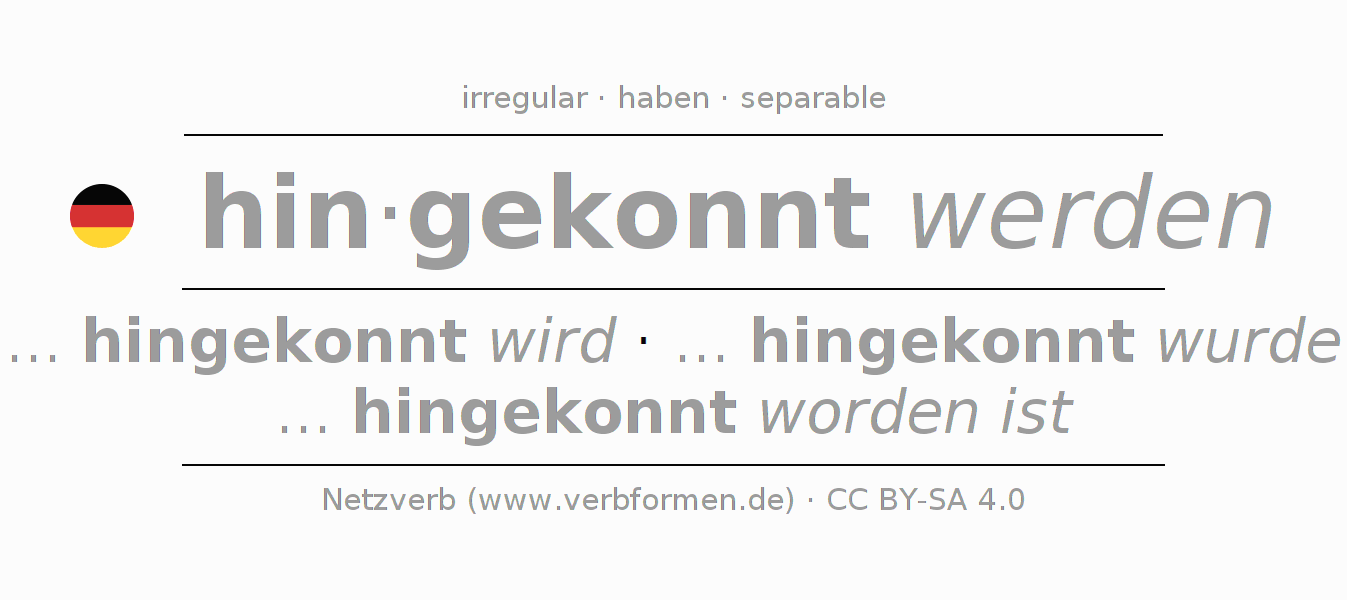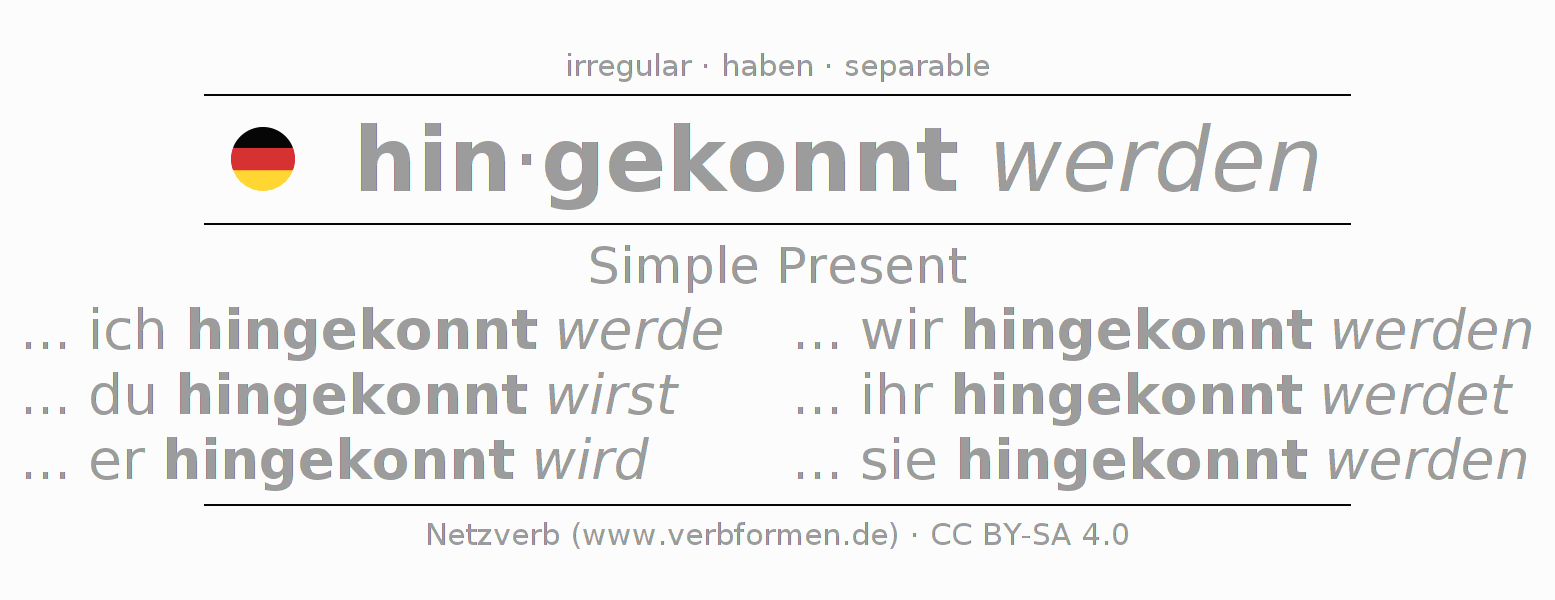 The conjugation of hinkönnen in Present Indicative Presence Passive is ... ich hingekonnt werde, ... du hingekonnt wirst, ... er hingekonnt wird, ... wir hingekonnt werden, ... ihr hingekonnt werdet, ... sie hingekonnt werden.The conjugation corresponds to certain grammatical rules. Likewise the requirements for the conjugation of the simple verb forms of hinkönnen in Present. Comments ☆