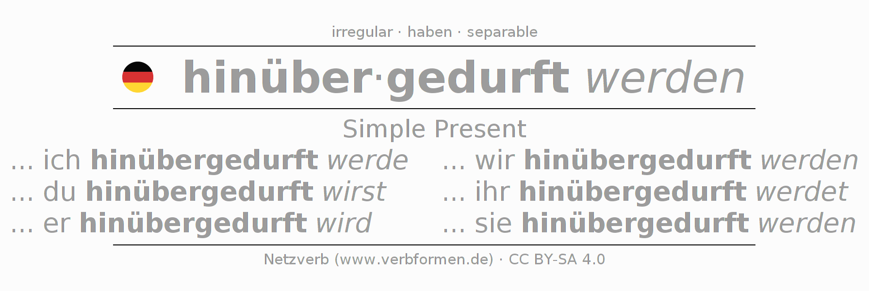 The verb hinüberdürfen fully conjugated in all persons and numbers in the Present Indicative