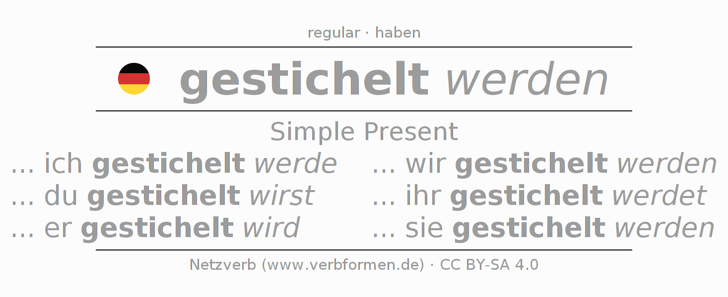 The conjugation of sticheln in Present Indicative Presence Passive is ... ich gestichelt werde, ... du gestichelt wirst, ... er gestichelt wird, ... wir gestichelt werden, ... ihr gestichelt werdet, ... sie gestichelt werden.The conjugation corresponds to certain grammatical rules. Likewise the requirements for the conjugation of the simple verb forms of sticheln in Present. Comments ☆