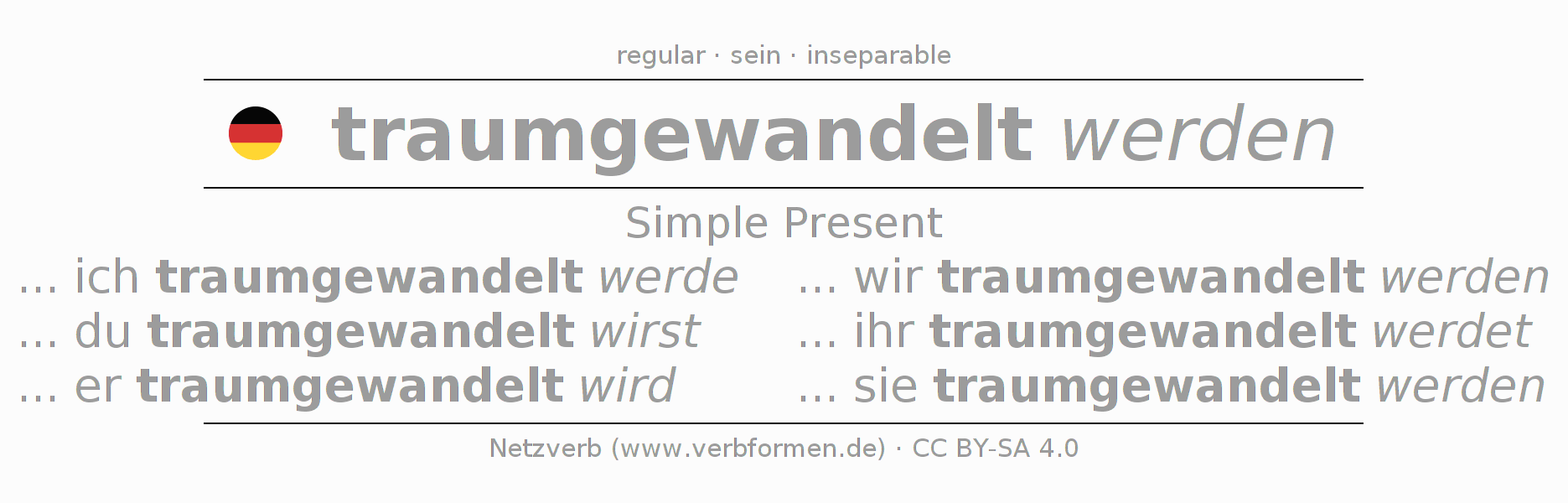 The conjugation of traumwandeln in Present Indicative Presence Passive is ... ich traumgewandelt werde, ... du traumgewandelt wirst, ... er traumgewandelt wird, ... wir traumgewandelt werden, ... ihr traumgewandelt werdet, ... sie traumgewandelt werden.The conjugation corresponds to certain grammatical rules. Likewise the requirements for the conjugation of the simple verb forms of traumwandeln in Present. Comments ☆