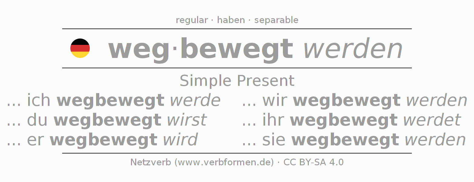 The conjugation of wegbewegen in Present Indicative Presence Passive is ... ich wegbewegt werde, ... du wegbewegt wirst, ... er wegbewegt wird, ... wir wegbewegt werden, ... ihr wegbewegt werdet, ... sie wegbewegt werden.The conjugation corresponds to certain grammatical rules. Likewise the requirements for the conjugation of the simple verb forms of wegbewegen in Present. Comments ☆