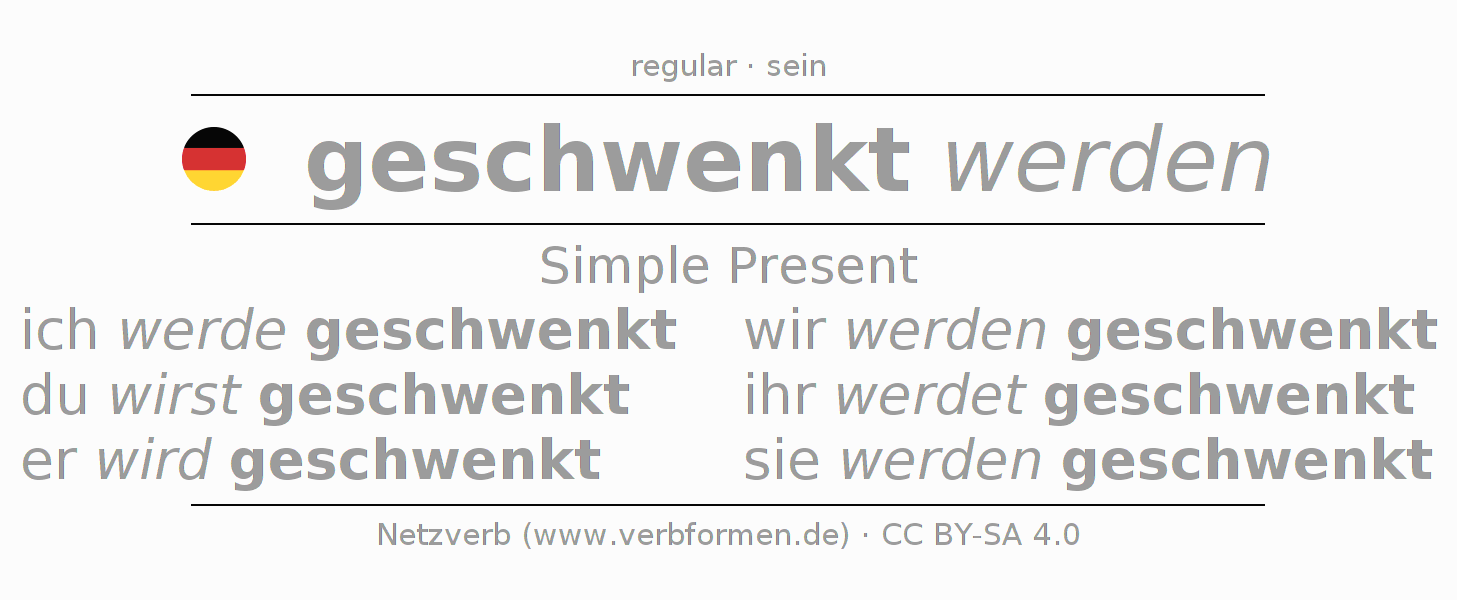 The conjugation of schwenken in Present Indicative Presence Passive is ich werde geschwenkt, du wirst geschwenkt, er wird geschwenkt, wir werden geschwenkt, ihr werdet geschwenkt, sie werden geschwenkt.The conjugation corresponds to certain grammatical rules. Likewise the requirements for the conjugation of the simple verb forms of schwenken in Present. Comments ☆