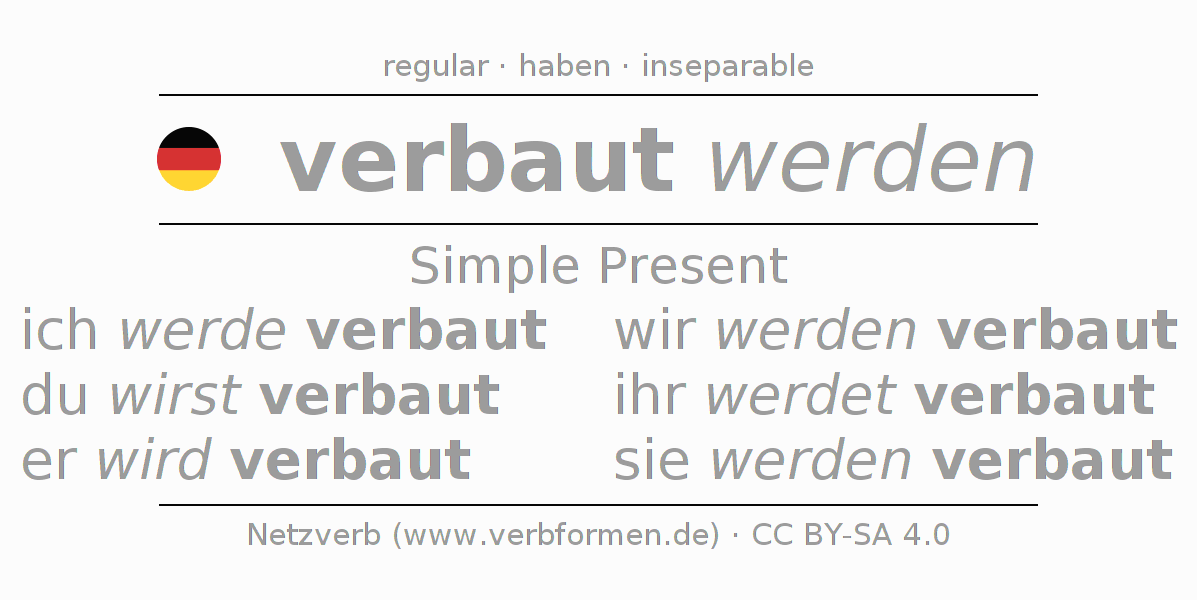 The conjugation of verbauen in Present Indicative Presence Passive is ich werde verbaut, du wirst verbaut, er wird verbaut, wir werden verbaut, ihr werdet verbaut, sie werden verbaut.The conjugation corresponds to certain grammatical rules. Likewise the requirements for the conjugation of the simple verb forms of verbauen in Present. Comments ☆