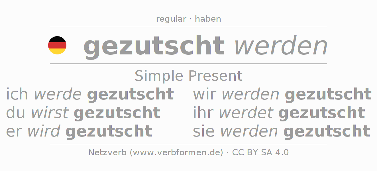 The conjugation of zutschen in Present Indicative Presence Passive is ich werde gezutscht, du wirst gezutscht, er wird gezutscht, wir werden gezutscht, ihr werdet gezutscht, sie werden gezutscht.The conjugation corresponds to certain grammatical rules. Likewise the requirements for the conjugation of the simple verb forms of zutschen in Present. Comments ☆