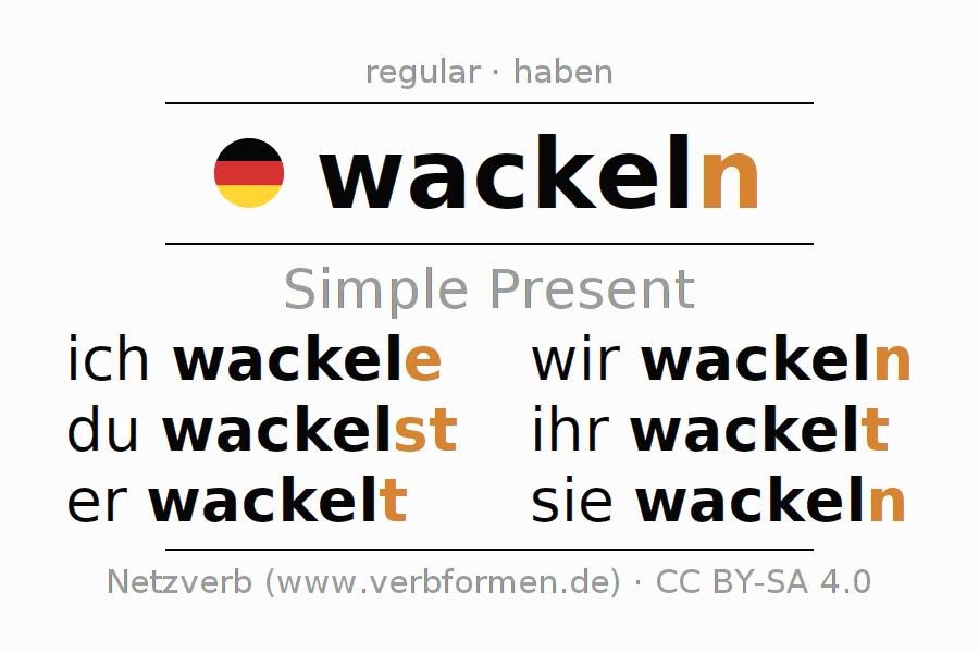 The conjugation of wackeln (shake, wiggle) in the present tense is: ich wack(e)le, du wackelst, er wackelt, wir wackeln, ihr wackelt, sie wackeln. For this purpose, the endings -e, -st, -t, -n, -t, -n are appended to the stem wackel. The endings in the 1st and 3rd person plural are shortened by "e", since the verb ends with -eln.In addition, the "e" in the stem can be omitted in the 1st person singular. The formation of the forms corresponds to the grammatical rules for the conjugation of the verbs in the present tense. Comments ☆