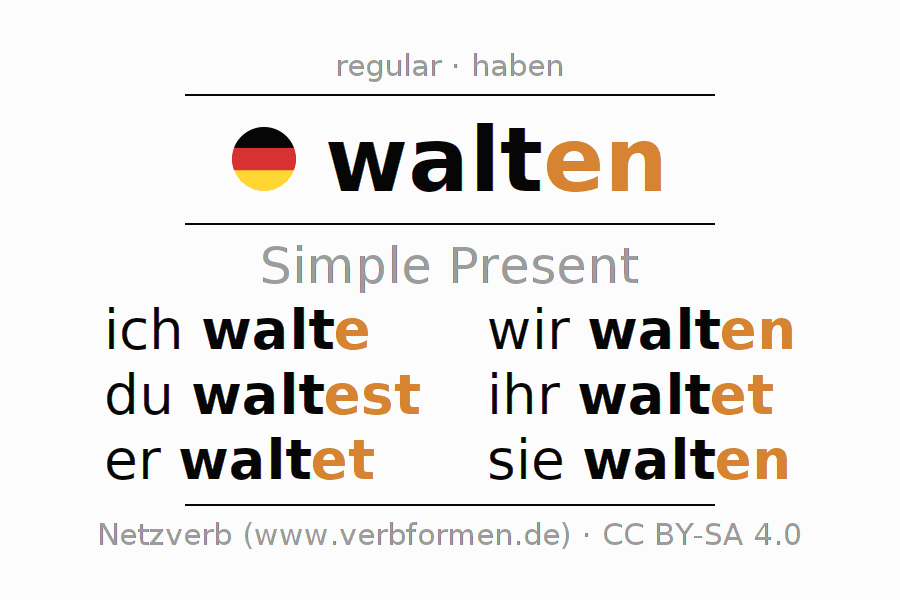 The conjugation of walten (prevail, rule) in the present tense is: ich walte, du waltest, er waltet, wir walten, ihr waltet, sie walten. For this purpose, the endings -e, -est, -et, -en, -et, -en are appended to the stem walt. The endings in the 2nd and 3rd person singular and in the 2nd person plural are extended by "e", as the stem ends on -t. The formation of the forms corresponds to the grammatical rules for the conjugation of the verbs in the present tense. Comments ☆