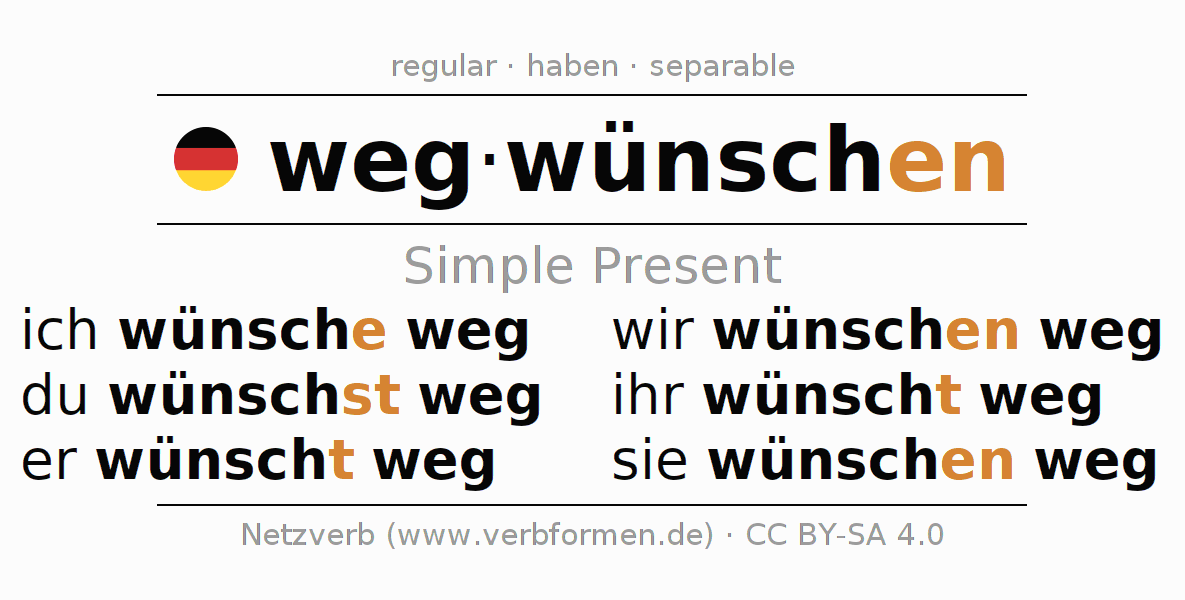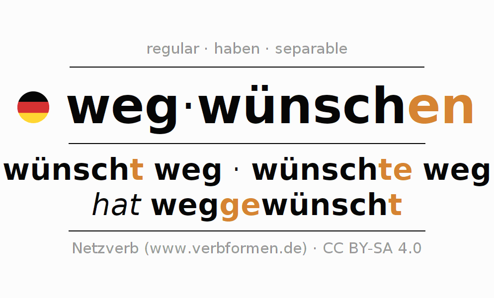 The conjugation of wegwünschen (wish away, remove by wish) in the present tense is: ich wünsche weg, du wünschst weg, er wünscht weg, wir wünschen weg, ihr wünscht weg, sie wünschen weg. For this purpose, the endings -e, -st, -t, -en, -t, -en are appended to the stem wünsch. The prefix weg- of wegwünschen is separated.The formation of the forms corresponds to the grammatical rules for the conjugation of the verbs in the present tense. Comments ☆