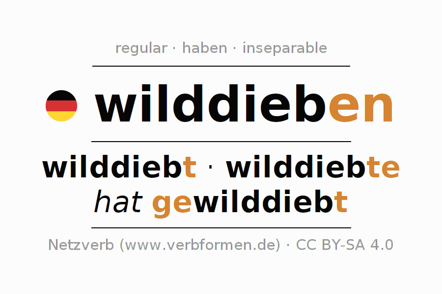 The conjugation of wilddieben (poach, illegal hunting) in the present tense is: ich wilddiebe, du wilddiebst, er wilddiebt, wir wilddieben, ihr wilddiebt, sie wilddieben. For this purpose, the endings -e, -st, -t, -en, -t, -en are appended to the stem dieb. The formation of the forms corresponds to the grammatical rules for the conjugation of the verbs in the present tense. Comments ☆