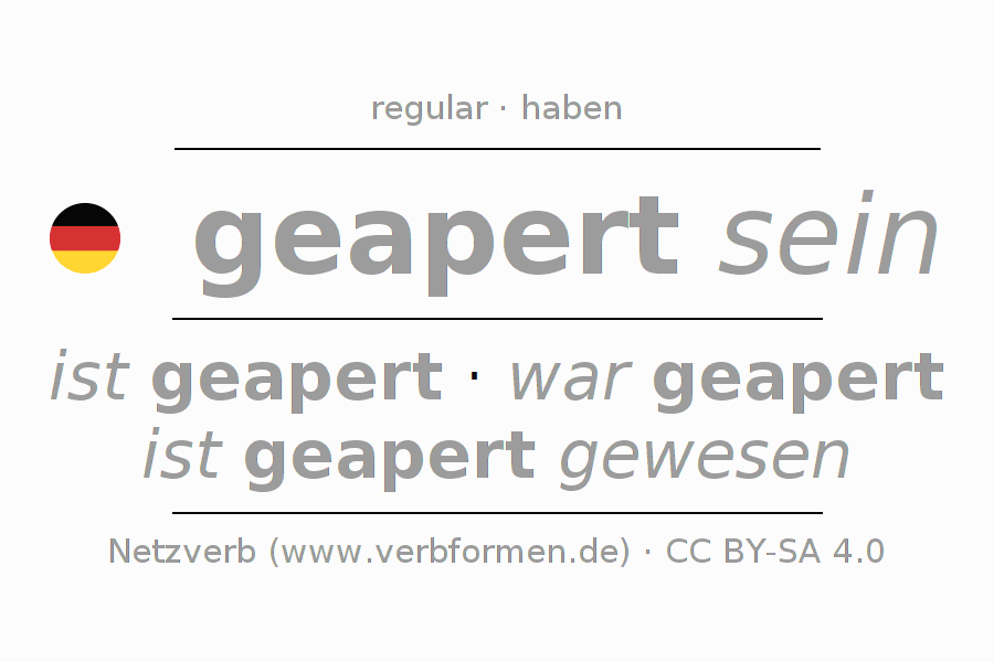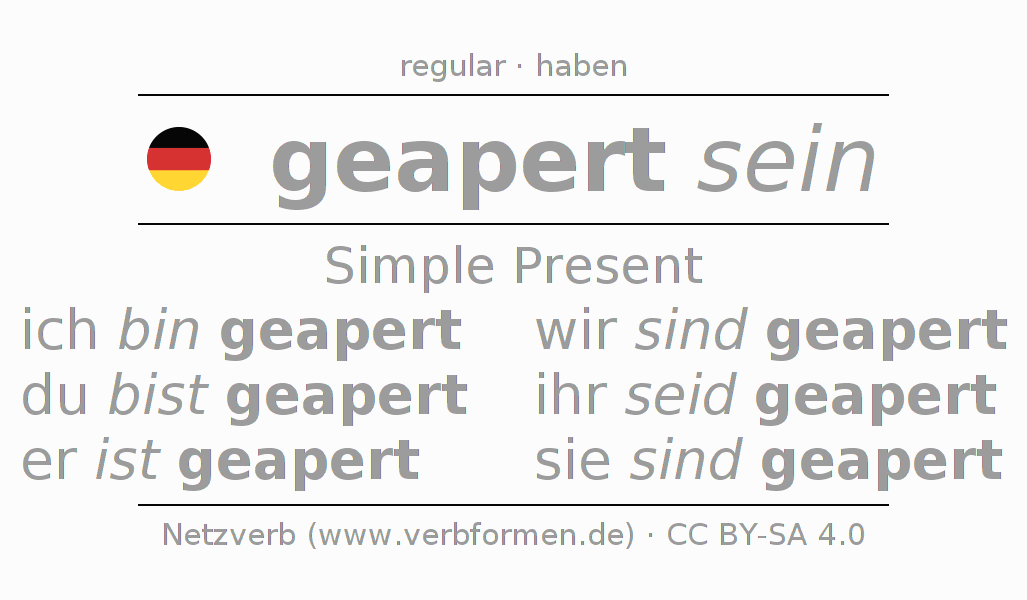 The conjugation of apern in Present Indicative Presence Statal Passive is ich bin geapert, du bist geapert, er ist geapert, wir sind geapert, ihr seid geapert, sie sind geapert.The conjugation corresponds to certain grammatical rules. Likewise the requirements for the conjugation of the simple verb forms of apern in Present. Comments ☆