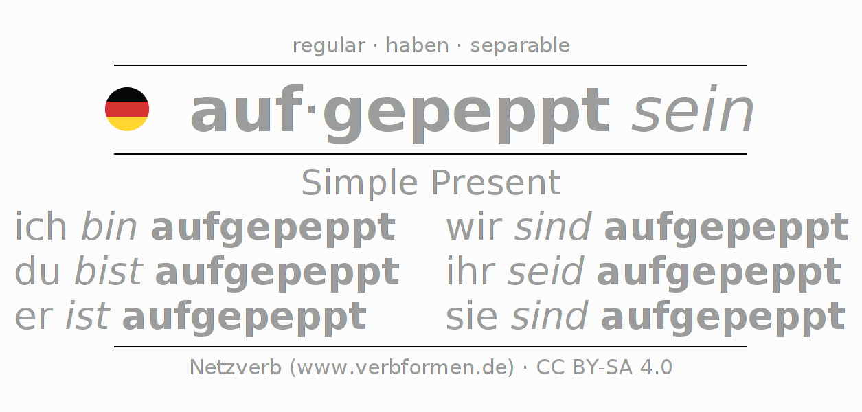 The conjugation of aufpeppen in Present Indicative Presence Statal Passive is ich bin aufgepeppt, du bist aufgepeppt, er ist aufgepeppt, wir sind aufgepeppt, ihr seid aufgepeppt, sie sind aufgepeppt.The conjugation corresponds to certain grammatical rules. Likewise the requirements for the conjugation of the simple verb forms of aufpeppen in Present. Comments ☆