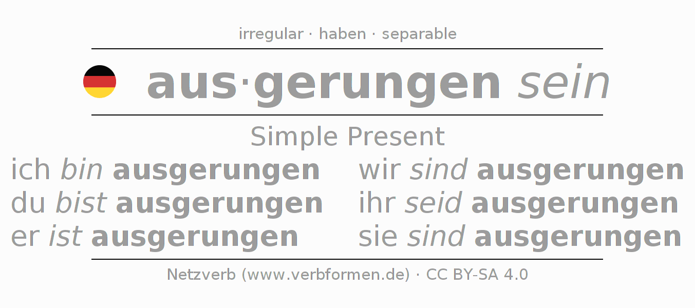 The conjugation of ausringen in Present Indicative Presence Statal Passive is ich bin ausgerungen, du bist ausgerungen, er ist ausgerungen, wir sind ausgerungen, ihr seid ausgerungen, sie sind ausgerungen.The conjugation corresponds to certain grammatical rules. Likewise the requirements for the conjugation of the simple verb forms of ausringen in Present. Comments ☆