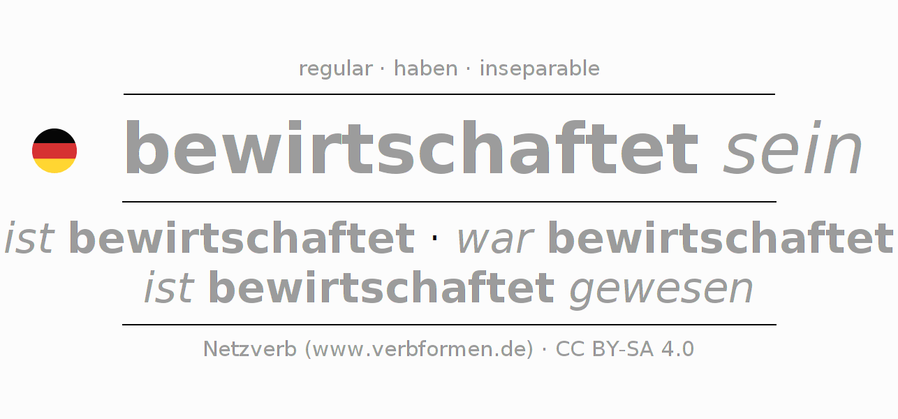 The conjugation of bewirtschaften in Present Indicative Presence Statal Passive is ich bin bewirtschaftet, du bist bewirtschaftet, er ist bewirtschaftet, wir sind bewirtschaftet, ihr seid bewirtschaftet, sie sind bewirtschaftet.The conjugation corresponds to certain grammatical rules. Likewise the requirements for the conjugation of the simple verb forms of bewirtschaften in Present. Comments ☆