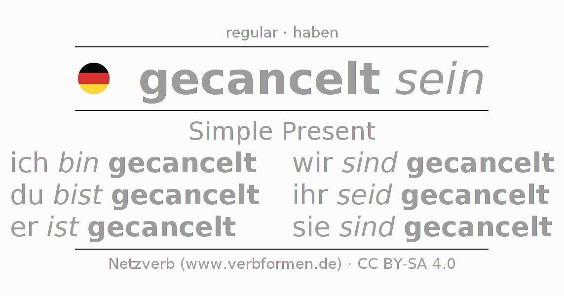 The conjugation of canceln in Present Indicative Presence Statal Passive is ich bin gecancelt, du bist gecancelt, er ist gecancelt, wir sind gecancelt, ihr seid gecancelt, sie sind gecancelt.The conjugation corresponds to certain grammatical rules. Likewise the requirements for the conjugation of the simple verb forms of canceln in Present. Comments ☆