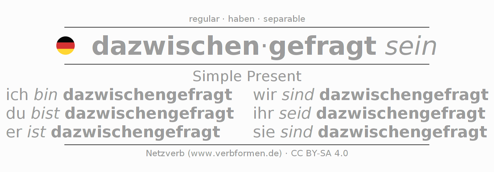 The verb dazwischenfragen (regelm) fully conjugated in all persons and numbers in the Present Indicative