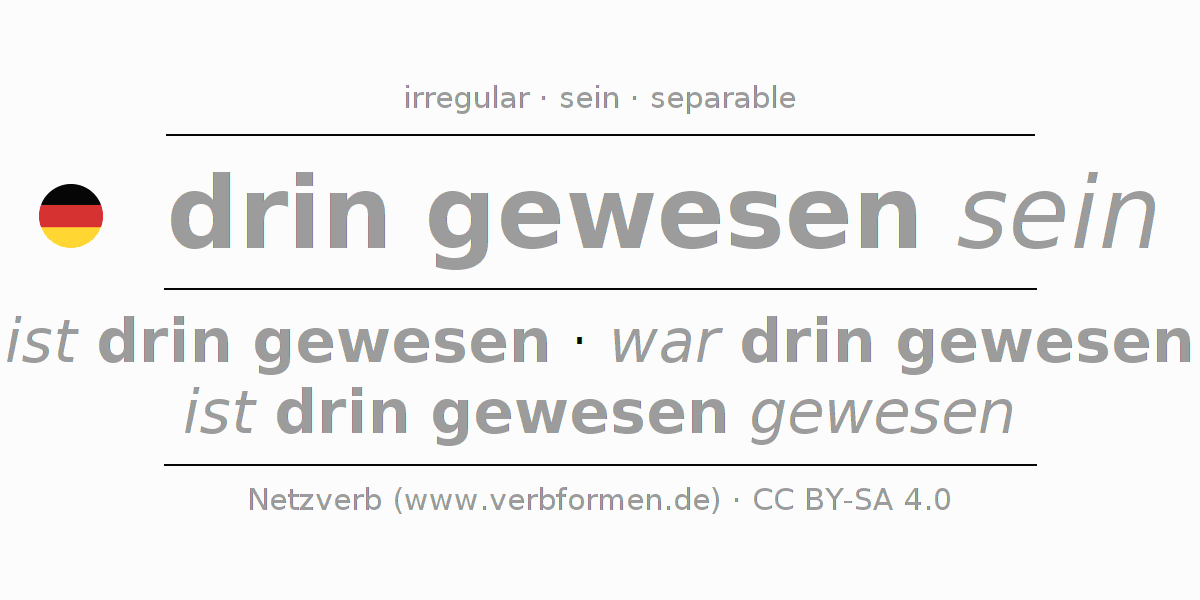 The conjugation of drinsein in Present Indicative Presence Statal Passive is ich bin drin gewesen, du bist drin gewesen, er ist drin gewesen, wir sind drin gewesen, ihr seid drin gewesen, sie sind drin gewesen.The conjugation corresponds to certain grammatical rules. Likewise the requirements for the conjugation of the simple verb forms of drinsein in Present. Comments ☆