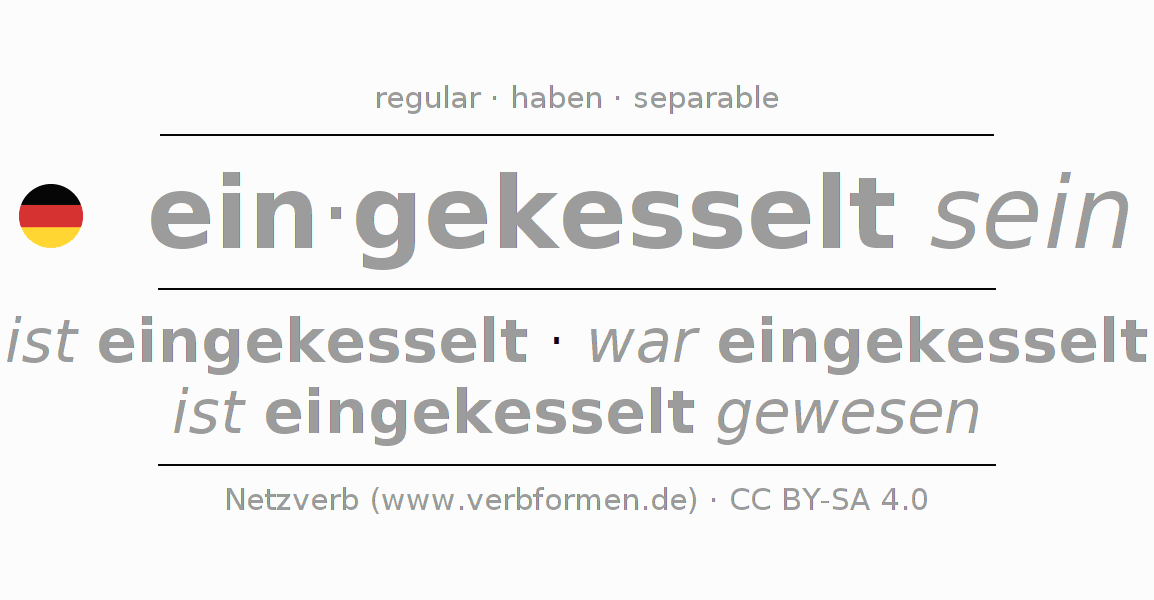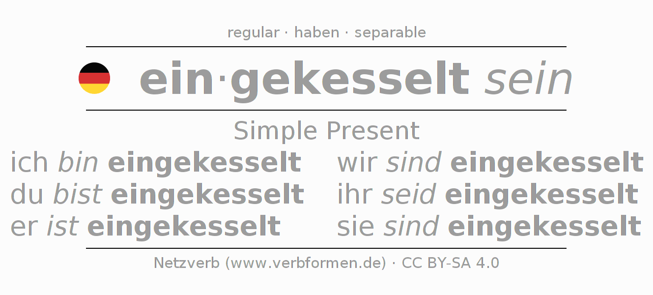 The conjugation of einkesseln in Present Indicative Presence Statal Passive is ich bin eingekesselt, du bist eingekesselt, er ist eingekesselt, wir sind eingekesselt, ihr seid eingekesselt, sie sind eingekesselt.The conjugation corresponds to certain grammatical rules. Likewise the requirements for the conjugation of the simple verb forms of einkesseln in Present. Comments ☆