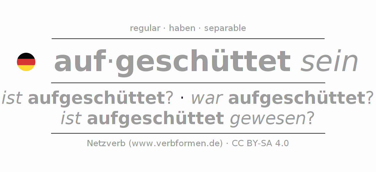 The conjugation of aufschütten in Present Indicative Presence Statal Passive is bin ich aufgeschüttet?, bist du aufgeschüttet?, ist er aufgeschüttet?, sind wir aufgeschüttet?, seid ihr aufgeschüttet?, sind sie aufgeschüttet?.The conjugation corresponds to certain grammatical rules. Likewise the requirements for the conjugation of the simple verb forms of aufschütten in Present. Comments ☆