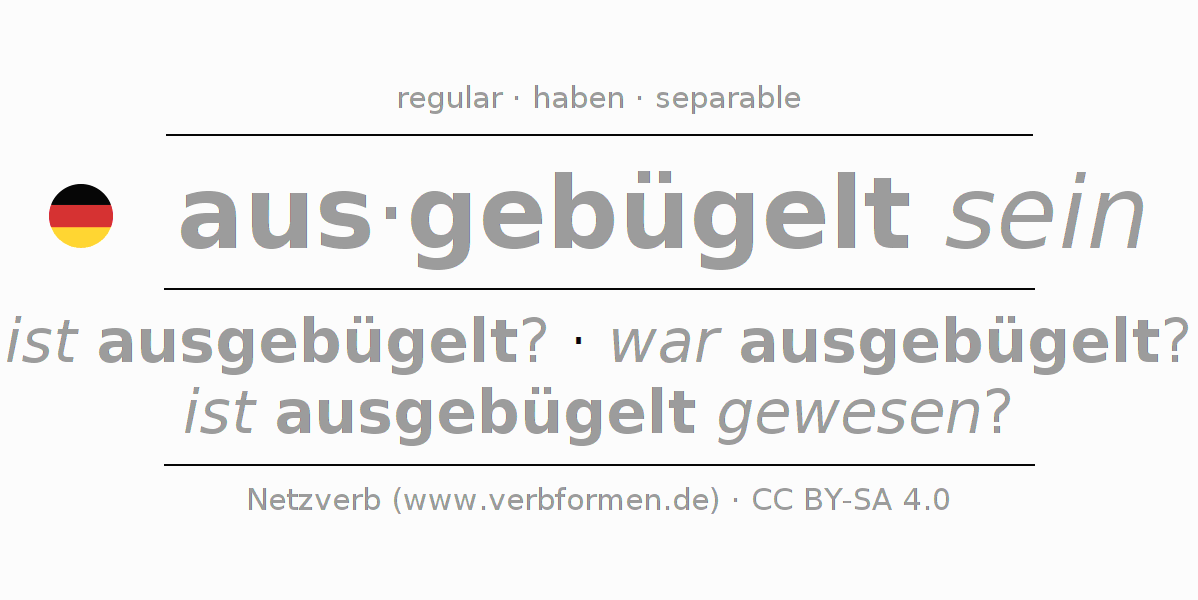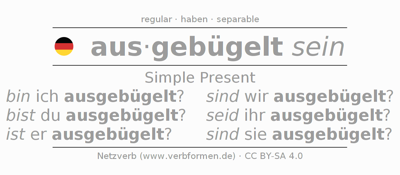 The conjugation of ausbügeln in Present Indicative Presence Statal Passive is bin ich ausgebügelt?, bist du ausgebügelt?, ist er ausgebügelt?, sind wir ausgebügelt?, seid ihr ausgebügelt?, sind sie ausgebügelt?.The conjugation corresponds to certain grammatical rules. Likewise the requirements for the conjugation of the simple verb forms of ausbügeln in Present. Comments ☆