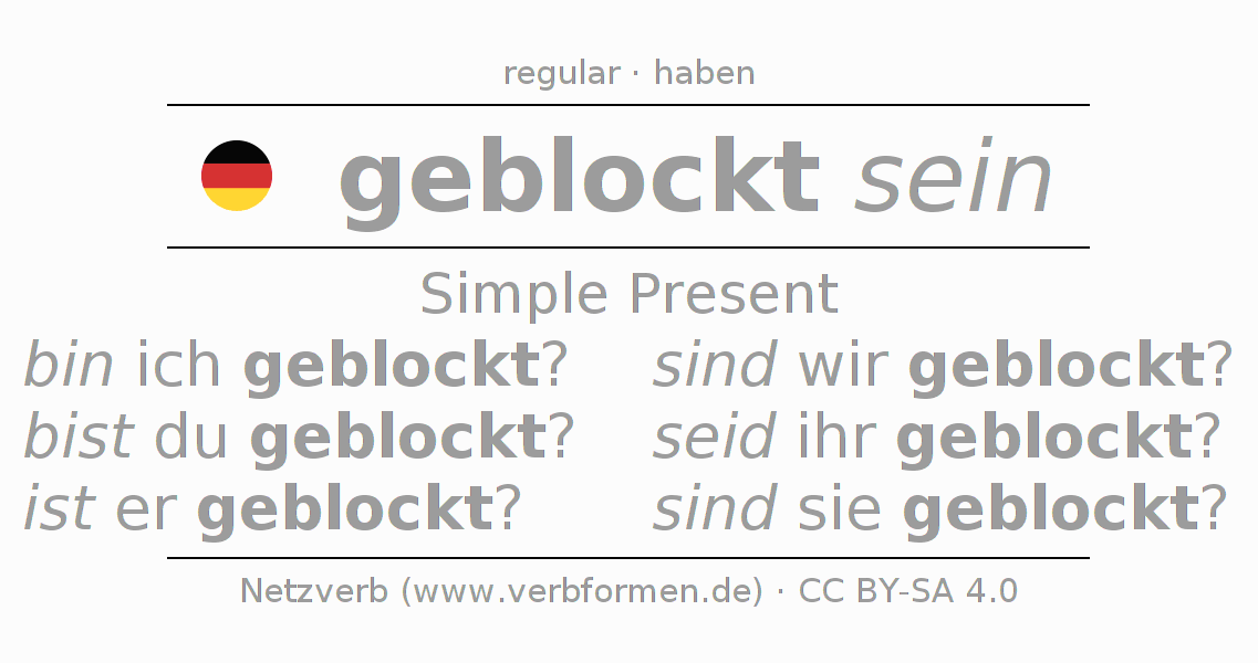 The conjugation of blocken in Present Indicative Presence Statal Passive is bin ich geblockt?, bist du geblockt?, ist er geblockt?, sind wir geblockt?, seid ihr geblockt?, sind sie geblockt?.The conjugation corresponds to certain grammatical rules. Likewise the requirements for the conjugation of the simple verb forms of blocken in Present. Comments ☆