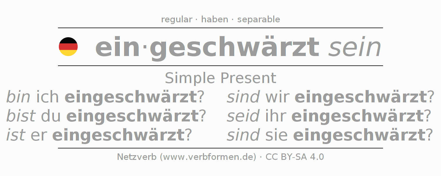 The conjugation of einschwärzen in Present Indicative Presence Statal Passive is bin ich eingeschwärzt?, bist du eingeschwärzt?, ist er eingeschwärzt?, sind wir eingeschwärzt?, seid ihr eingeschwärzt?, sind sie eingeschwärzt?.The conjugation corresponds to certain grammatical rules. Likewise the requirements for the conjugation of the simple verb forms of einschwärzen in Present. Comments ☆