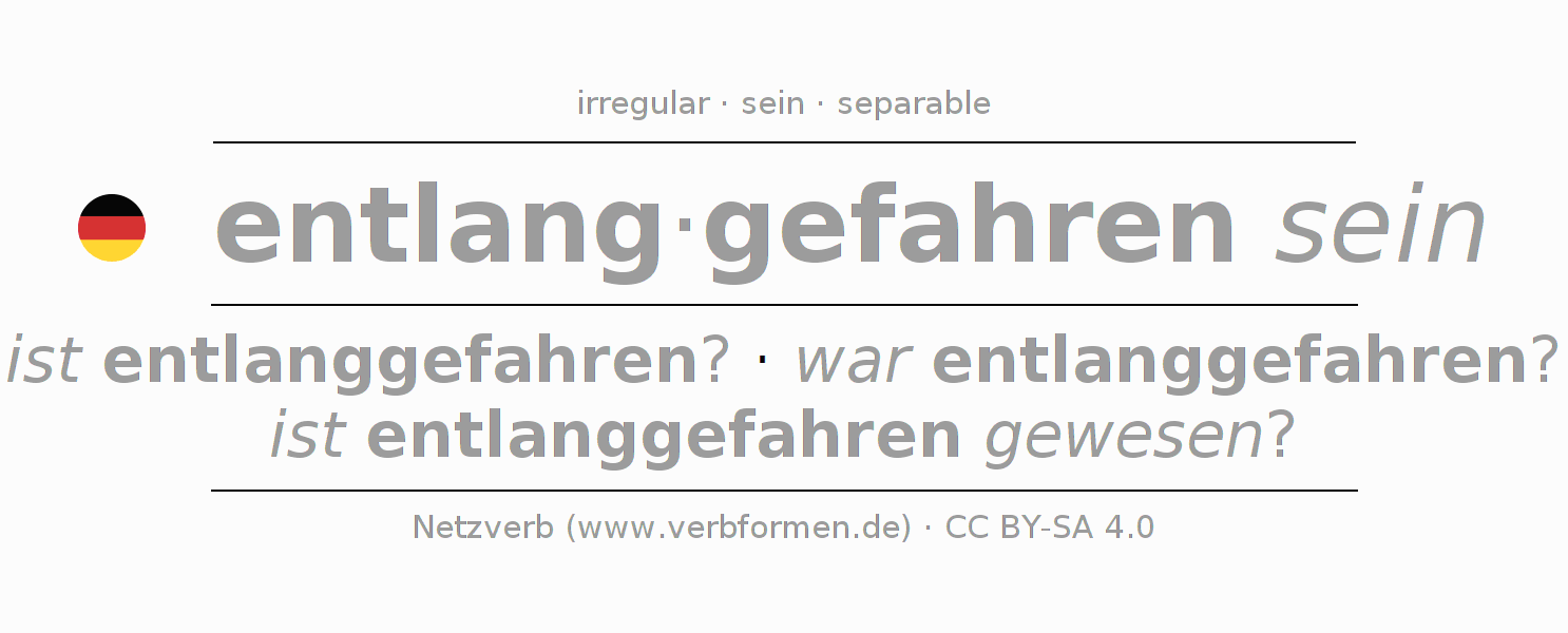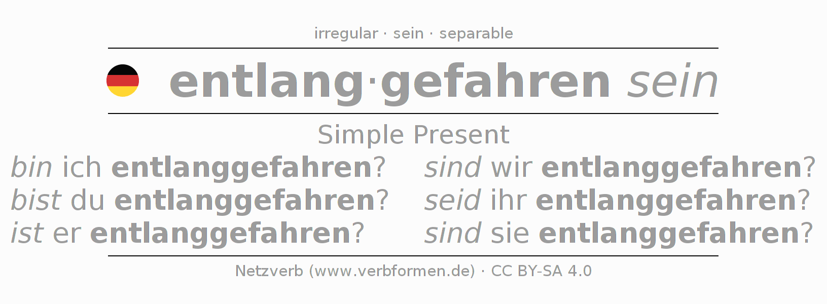 The conjugation of entlangfahren in Present Indicative Presence Statal Passive is bin ich entlanggefahren?, bist du entlanggefahren?, ist er entlanggefahren?, sind wir entlanggefahren?, seid ihr entlanggefahren?, sind sie entlanggefahren?.The conjugation corresponds to certain grammatical rules. Likewise the requirements for the conjugation of the simple verb forms of entlangfahren in Present. Comments ☆
