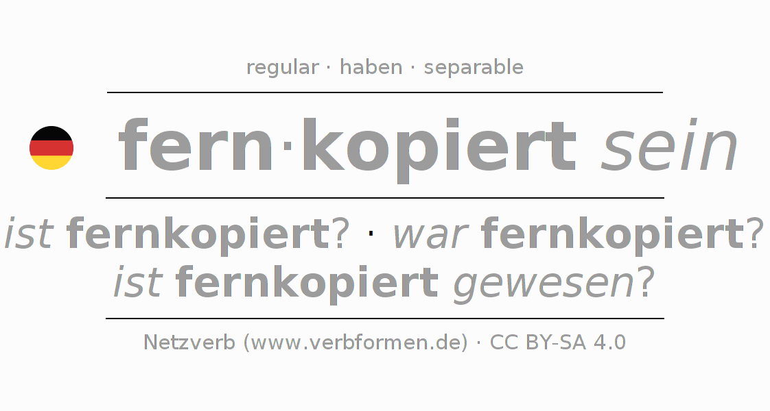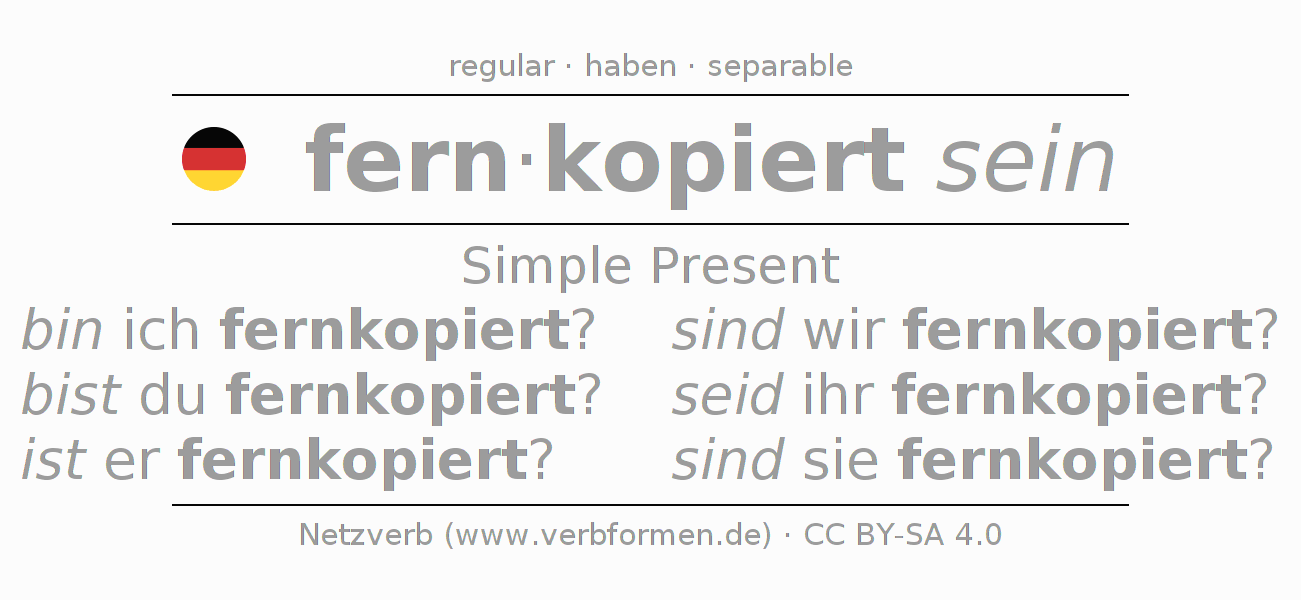 The conjugation of fernkopieren in Present Indicative Presence Statal Passive is bin ich fernkopiert?, bist du fernkopiert?, ist er fernkopiert?, sind wir fernkopiert?, seid ihr fernkopiert?, sind sie fernkopiert?.The conjugation corresponds to certain grammatical rules. Likewise the requirements for the conjugation of the simple verb forms of fernkopieren in Present. Comments ☆