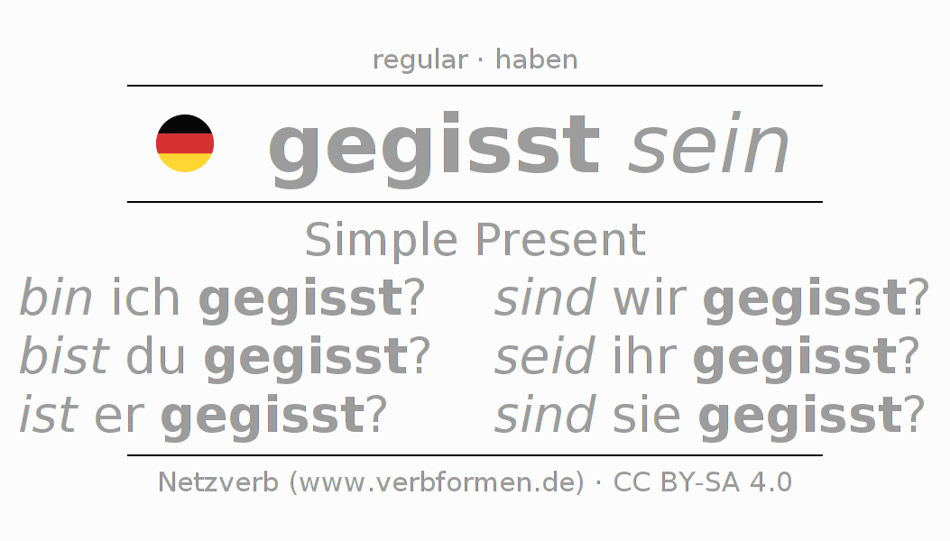 The conjugation of gissen in Present Indicative Presence Statal Passive is bin ich gegisst?, bist du gegisst?, ist er gegisst?, sind wir gegisst?, seid ihr gegisst?, sind sie gegisst?.The conjugation corresponds to certain grammatical rules. Likewise the requirements for the conjugation of the simple verb forms of gissen in Present. Comments ☆